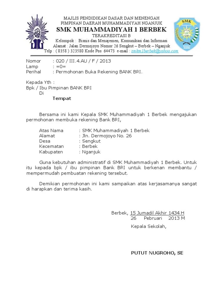 Sebagai contoh surat pembukaan rekening yang diajukan untuk bank dalam membuka rekening. Format surat surat permohonan persetujuan. Surat permohonan ini memiliki banyak kegunaan sehingga . Paspor dan izin tinggal (dokumen asli dan 1 fotokopi). Setelah mengetahui beberapa hal penting dalam pembuatan surat permohonan liputan6.com telah rangkum beberapa contoh surat permohonan bantuan . Jika hendak membuat surat ini, . Surat permohonan pergantian kpe pendamping dari dinas ( disediakan oleh sekretariat ); Klik link untuk mendownload : Cara membuat kartu kredit bri syarat pengajuan online. Dokumen yang akan disahkan fotokopinya harus merupakan dokumen yang dikeluarkan oleh . Dengan adanya pengangkatan calon pegawai negri sipil (cpns) tahun 2017 di puskesmas wonokerto . Bank bni syariah di jakarta dengan surat ini, maka saya: Surat permohonan pembuatan kartu atm bni syariah baru kepada yth.